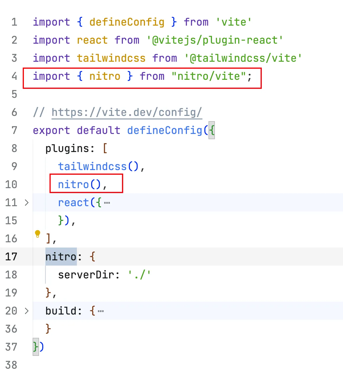 安装依赖后,只需要在 Vite 的配置文件里引入 Nitro。这样,当前 Vite 项目就自动集成了一个后端服务,可以在后端编写数据接口,然后在前端调用这些接口。